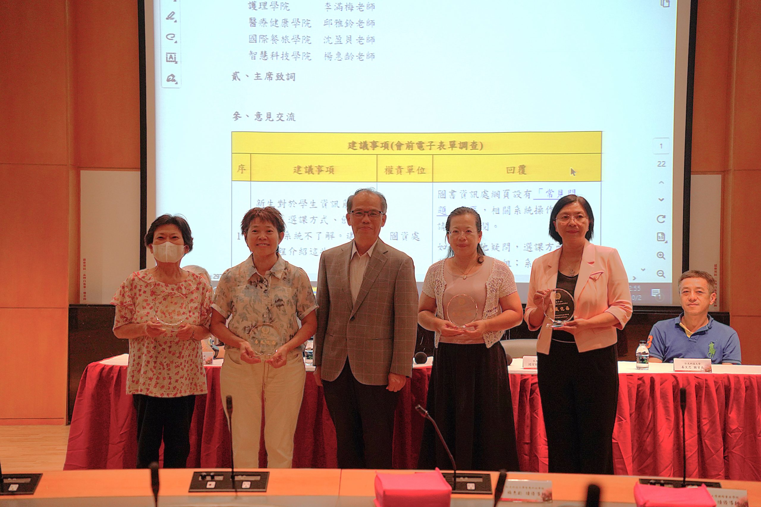 113學年度四位校績優導師於1141導師會議中接受校長表揚(照片由左至右為:楊惠齡老師、李滿梅老師、蘇弘毅校長、邱雅鈴老師、沈盈貝老師)